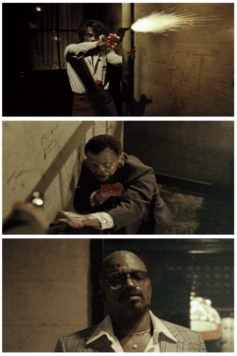 BG, initially released with the title ***** (pronounced “redacted”), is named somewhat cryptically after the Hollywood actor Ben Gazzara, known for his gritty portrayals of problematic characters. The seed for BG was planted nearly fifty years ago, when filmmaker and artist Arthur Jafa (b. 1960) was still in high school and first saw Martin Scorsese’s Taxi Driver (1976), the neo-noir thriller and gritty psychological study of a sociopath. The script, written by Paul Schrader, follows a taxi-driving Vietnam vet named Travis Bickle, played by a young Robert De Niro. Travis largely fails in love and life—today, we’d call him an incel—and he turns his vigilante rage toward a pimp—Sport, played by Harvey Keitel—who controls and abuses Iris, a child prostitute played by a twelve-year-old Jodie Foster. In the climactic scene—and the raw material for Jafa’s BG—Travis endeavors to free Iris by pumping lead into Sport, the brothel’s bouncer, and a mafioso client in a bloodbath equally calculating and grisly. Travis’s suicide attempt is stymied by a lack of bullets, and, with the arrival of the police, he forms his bloody fingers into the shape of a gun and mimes three shots to his head before passing out. An overhead tracking shot surveys the carnage in the room, down the stairs, through the hallway, and into the street, where a crowd has formed and police have secured the scene. Figure 2