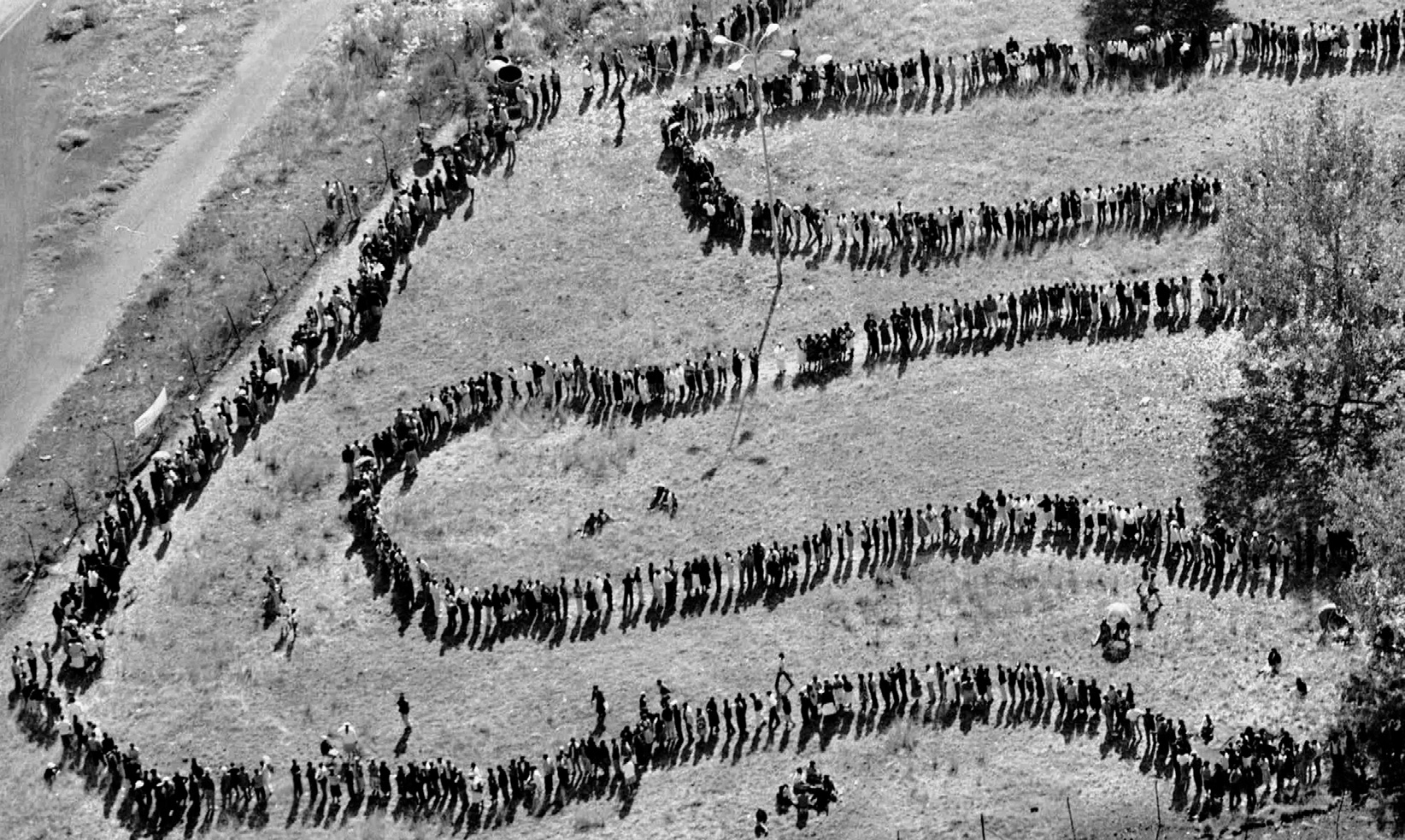 Citizens line up to vote for the first time in Soweto, South Africa, 27 April 1994. Photography by Denis Farrell/ Associated Press.