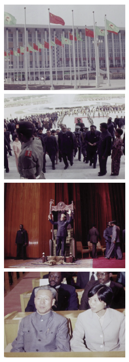 [fig 1] In May 1979, inaugural ceremonies were held for the People’s Palace completed in Kinshasa, Zaire’s capital (now the Democratic Republic of Congo, or DRC). The monument was designed and financed, and its construction co-managed, by the People’s Republic of China (PRC). Accompanying news footage of the Palace’s opening pageantry highlights that not one but two state actors were responsible for the building’s production. A close shot of its main façade is foregrounded by two parallel lines of flags alternatively representing the two republics, PRC and Zaire. The scene cuts to Zaire’s founding father, President Mobutu Sese Seko (1930–1997), né Joseph-Désiré Mobutu, clad in emblems of what V.S. Naipaul described as “his African chieftaincy”: leopard-skin toque, Mao Zedong-inspired jacket, and elaborately carved walking stick.1 A cutaway shot captures an adoring crowd of Kinshasa residents clapping and wildly waving their hands, held at bay by several armed soldiers. Mobutu cuts a ceremonial ribbon to polite applause from Zairian, Chinese, and other foreign representatives. He then ascends the building’s main stairs, swinging his hardwood stick upward and balancing it vertically in his palm. Interior sequences include Mobutu dramatically gesturing for the audience to sit with a slight bow, followed by an awkwardly edited pan of the hall’s silent, motionless onlookers. A choreographed group dance by Zairian performers is followed by a glimpse of Zhou Boping (周伯萍), Chinese ambassador to Zaire, watching impassively with an interpreter from the audience. Other foreign diplomats, including Chinese and Belgian officials, are also featured, each attentively facing the camera. End scene.