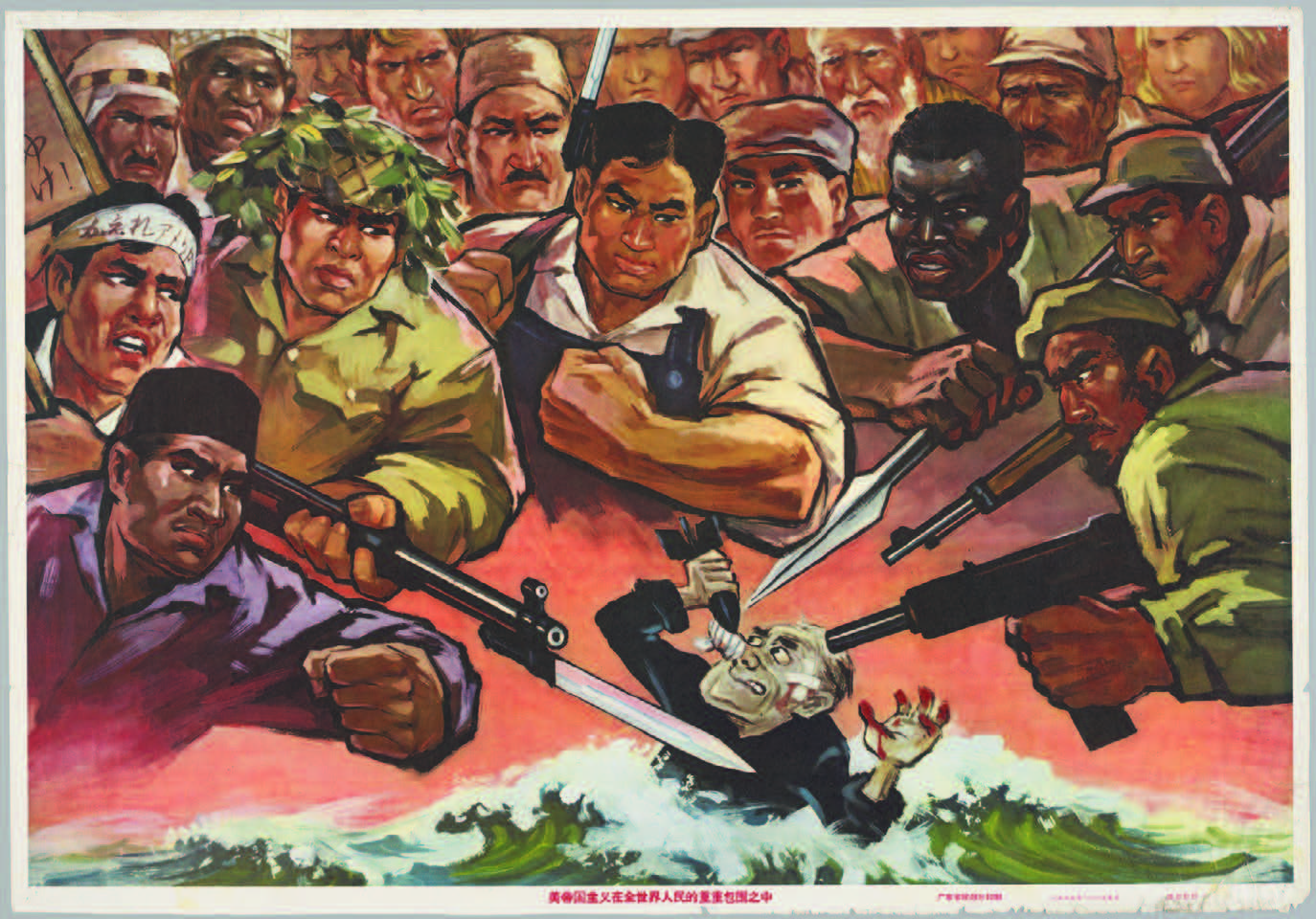Early visualizations of such conceptual space can be found in socialist Chinese artwork, which aided in creating both a representational language of solidarity and a conceptual common ground between the PRC and potential allies in Africa, the Middle East, and Southeast Asia.13 A series of state-commissioned propaganda posters printed between 1960 and 1965, for example, showed pictorial variations of an empowered global majority mobilized against an embattled United States. One 1960 poster by Zhou Anqi (周安琪) and Yuan Jiqing (袁继清), “American imperialism is the most fiendish enemy of world peace!” (美帝国主义是世界和平最凶恶的敌人! Mei diguo zhuyi shi shijie hepingde zui xiong’e de diren), consists of a circle of multiethnic fists enclosing the U.S. president Dwight Eisenhower, who cowers as he holds a suitcase labeled “warmongering” (备战; beizhan) and a bomb marked “invasion” (侵略; qinlüe). A 1965 poster designed by Lu Shaoquan (陆绍权) titled “American imperialism is encircled ring upon ring by the people of the world” (美帝国主义在全世界人民的重重包围之中; Mei diguo zhuyi zai quan shijie renminde chongchong baowei zhi zhong) captures an armed crowd of interracial soldiers, farmers, and workers angrily prodding a bandaged and bloodied President Lyndon Baines Johnson. Bomb in hand, Johnson flails about in an unidentified body of choppy water.