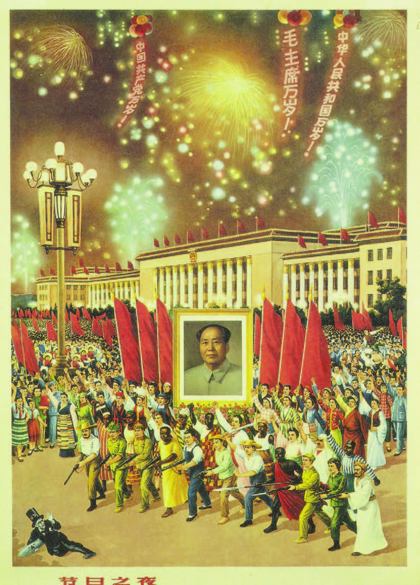 Across the range of socialist Chinese artistic production from the era, several posters stand out for their merging of Mao’s iconography, sloganeering, and the world’s global majority within a specific, physical context. In particular, one 1964 poster titled “Night Festival” (节日之夜; Jieri zhi ye), features a portrait of Mao hoisted atop a wave of nonwhite bodies, marching through Tiananmen Square and seemingly propelled forward by the architectural bulwark of Beijing’s Great Hall of the People itself. A frail Uncle Sam, alone and cornered by an angry world majority, clutches a single A-bomb. A series of balloon-tethered streamers hail Mao, the CCP, and the PRC.