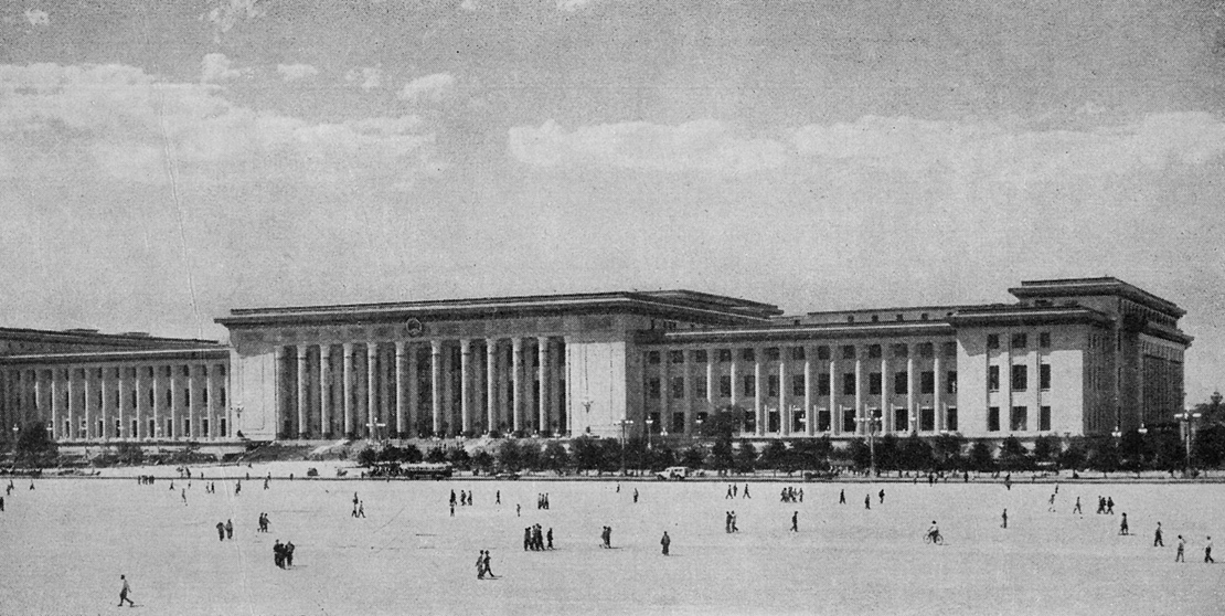 Completed just five years prior to the poster’s production, the presence of both the Great Hall of the People and Tiananmen Square signal the emergence of a physical template with the potential to spatialize the power of the world’s proletariat—again, mustered by the PRC itself—to distinctive, concentrated geopolitical effect. Despite obvious compositional and stylistic influences derived from China’s pre-1949 absorption of the Beaux Arts and Stalin-era Soviet design, both the building and its adjoining square were designed to re-center the capital and the country at large around the people through massive spaces that signified an openness and visibility largely based on physical scale itself. As the location for the National People’s Congress, the Great Hall comprised a massive assembly hall for 10,000 people and thirty-four regional halls named after the country’s thirty-four provinces, autonomous regions, and municipalities. Collectively, these spaces represented—and stabilized—the political geography of the young socialist Chinese nation.15