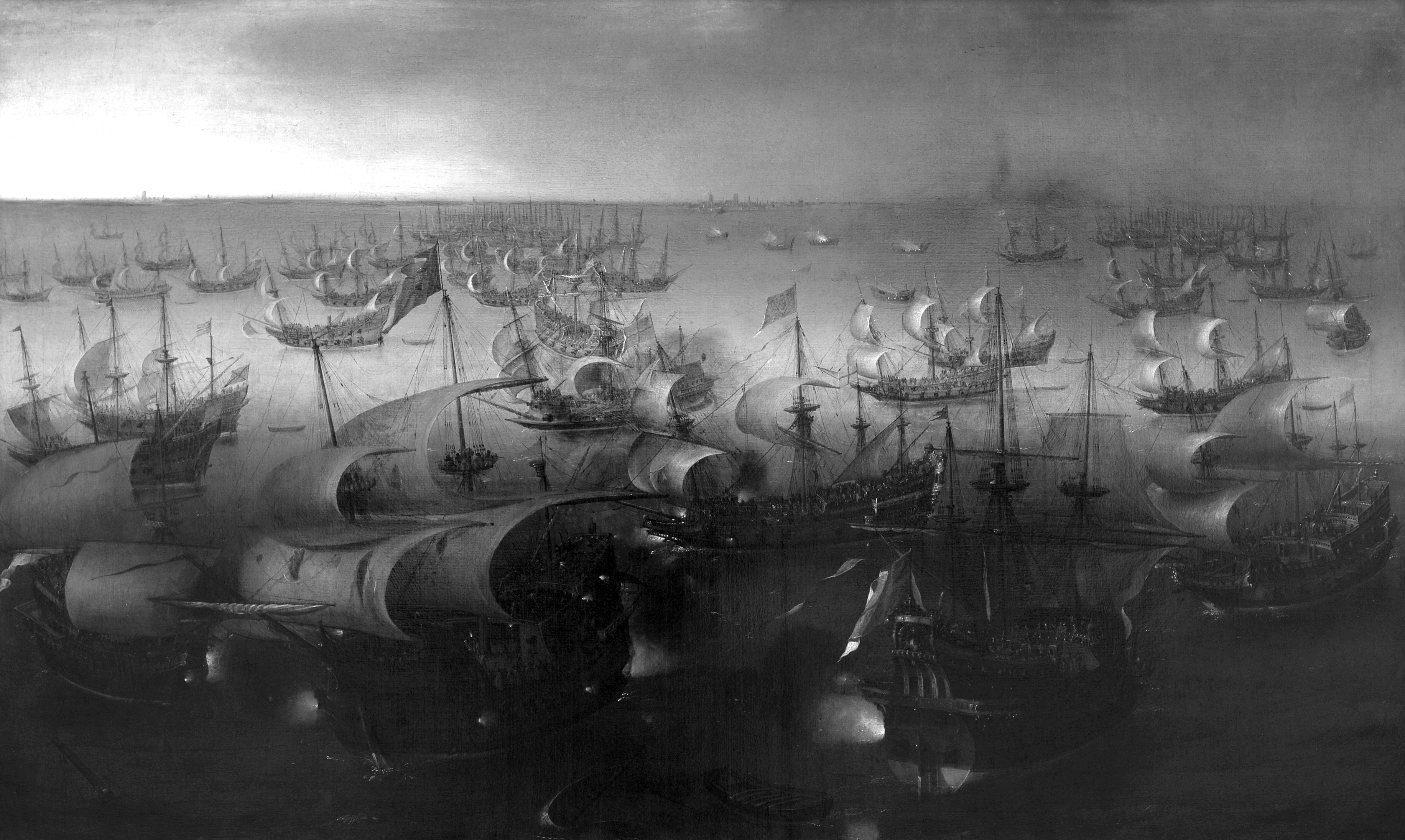 Hendrick Cornelisz. Vroom. The Seventh Day of the Naval Battle between the Spanish Armada and the English Fleet, 1600 or 1601. Oil on canvas, 36 x 60.1 in. (91.4 x 152.8 cm). Tiroler Landesmuseum Ferdinandeum, Innsbruck, Austria.