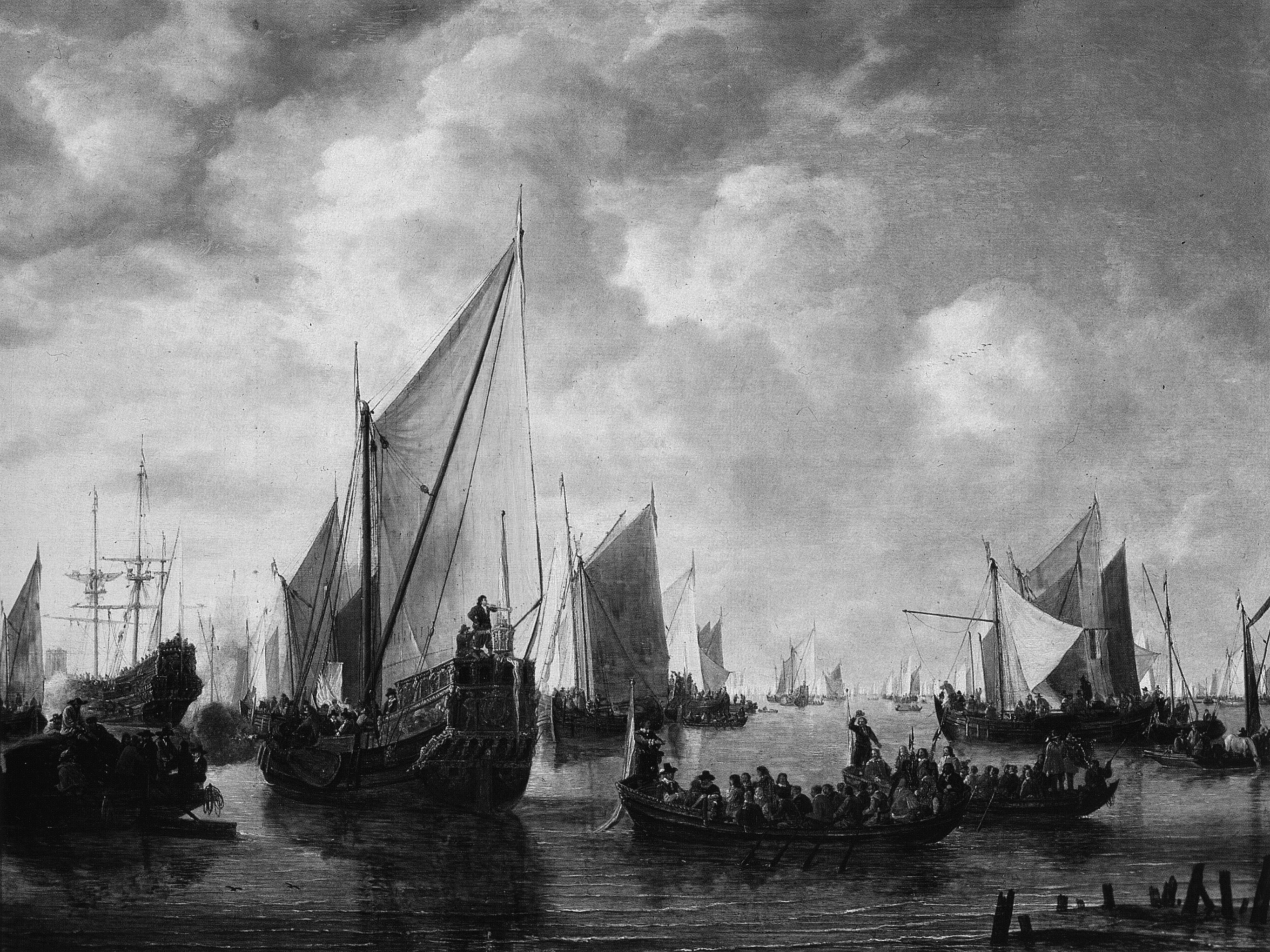 The undifferentiable swarming of boeiers and vlieboats, which once appeared on Vroom’s Fleet Landing, soon gave way to allegorical representations that expressed the new political self-image of the cities, which expanded their sphere of control to the oceans. See, for instance, Vroom’s Gezicht op Hoorn from 1622 or Simon de Vlieger’s painting from 1649 showing the disembarking of the Prince of Orange. The jaght turned into the statensyacht, a type of a vessel and the preferred motif of numerous Dutch seascapes. As the name, which means “hunt,” indicates, a jaght was a small privateer, esteemed because of its speed. The statensyacht, however, does not hunt; it exists only for the representative purpose of transporting heads of state and war heroes from the pier to their ships and vice versa. The statensyacht is a metaphor in the literal sense: it constitutes the transmission between the state and its symbol, the ship of state. A monstrous sort of ship, the statensyacht combines a former pirate’s vessel with a monumental adornment at its stern. What originally was meant to become invisible in situations where land and sea get confused, appears now as a vehicle for representative acts of state on the mirror of the sea, now degraded to serve the needs for representation of a state that rules the waves.