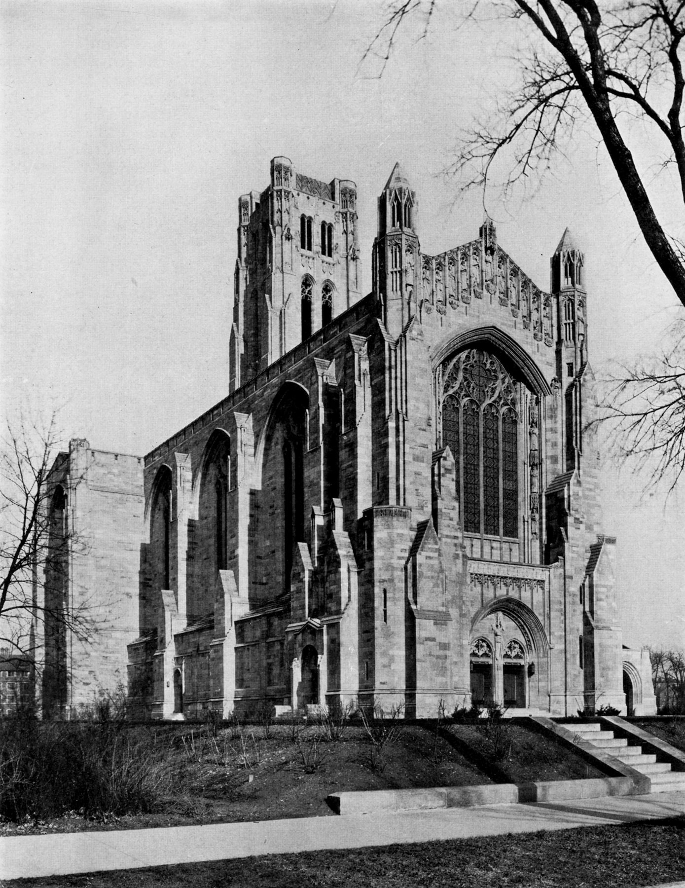 In 1918, with the Rockefeller funds in hand, Judson selected the New York– based architect Bertram Grosvenor Goodhue to execute the chapel commission. The idiom was to be Gothic Revival, in reference to European cathedrals (which Goodhue studied closely) and in keeping with existing campus buildings designed mainly by Cobb and by Charles Allerton Coolidge. Following Goodhue’s sudden death in 1924, work on the chapel was completed by the successor firm of Mayers, Murray and Phillip. Much can be said about the resulting building’s location near the campus threshold, its monumental scale (it was to be the university’s tallest building to date), its stony exterior, and its stripped-down Gothic proportions and detailing. But here Ip. 87 Figure 3