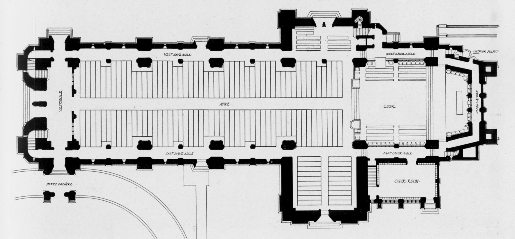 At this point the most significant acoustic issue for churches, auditoria, and lecture halls was the overlap of sounds and blending of words due to reverberation. The definitive solution, which included an equation and a new unit of measure (the sabin), had been developed in the 1910s by Wallace C. Sabine, the physicist pioneer of acoustic science, whom Goodhue had introduced to Raphael Guastavino in 1911, and with whom he collaborated until Sabine’s death in 1919.24 Sabine was a strict empiricist; he began his acoustical work with modifications to the auditorium in Harvard’s newly constructed Fogg Art Museum in 1895 and achieved nationwide notoriety through his collaboration with Charles F. McKim on the Boston Symphony Hall in 1900. Goodhue may have consulted Sabine while developing the initial designs for the chapel; in any event, he was intimately familiar with Sabine’s approach. Watson and White’s assessment also conformed with that approach by recommending that a total of 32,000 square feet of soundabsorbing plaster and tiles be installed on the ceiling and the side walls. They were confident that such an acoustical treatment, combined with the correct placement and enclosure of the organ, would render the music performed inp. 88 Figure 4