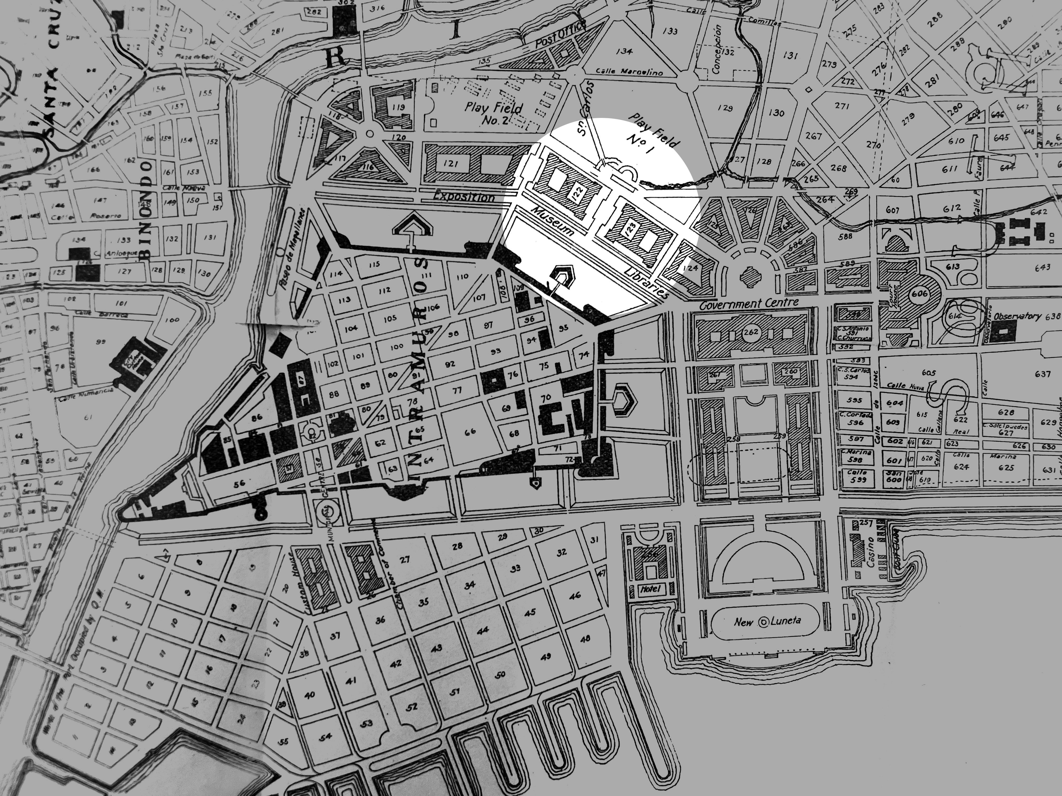 From 1907 until 1924, the Philippine legislature met in the Ayuntamiento de Manila, the old seat of Spanish colonial governance. Situated in the center of Intramuros’s (the old walled city) gridiron plan, the Ayuntamiento was, Nacionalistas believed, an insufficiently powerful symbol—too burdened by a colonial past to serve as a monument to the birth of a nation. The new Legislative Building broke out of the walled city’s confines to occupy a place of prominence within the 1905 Manila plan prepared by Chicago-based architect Burnham, under commission from then Governor General William Howard Taft. The centerpiece of Burnham’s plan—an uncannily familiar monumental core was (just as at Washington, DC) organized around an obelisk, in this case dedicated to the unofficial hero of the nation, José Rizal (the obelisk would be placed atop the approximate site of his execution). Placed in the middle of a semicircular court, Rizal’s cenotaph was surrounded by a half-ring of executive bureaus and bookended by a massive capitol building. Planted boulevards spring from this same point in space, radiating outward into the city, unifying Manila’s existing suburbs, or arrabales, while providing a structure for the city’s future growth. On the other side of the planned capitol was a U-shape government center gathered around an open mall (modeled after Burnham’s renovation of the Washington Mall and the Columbian Exposition’s “Court of Honor”). Facing west, toward the center of imperial power, the mall looked out on Manila Bay, prefaced by an expansive lawn, eventually named “Burnham Green” after its planner.