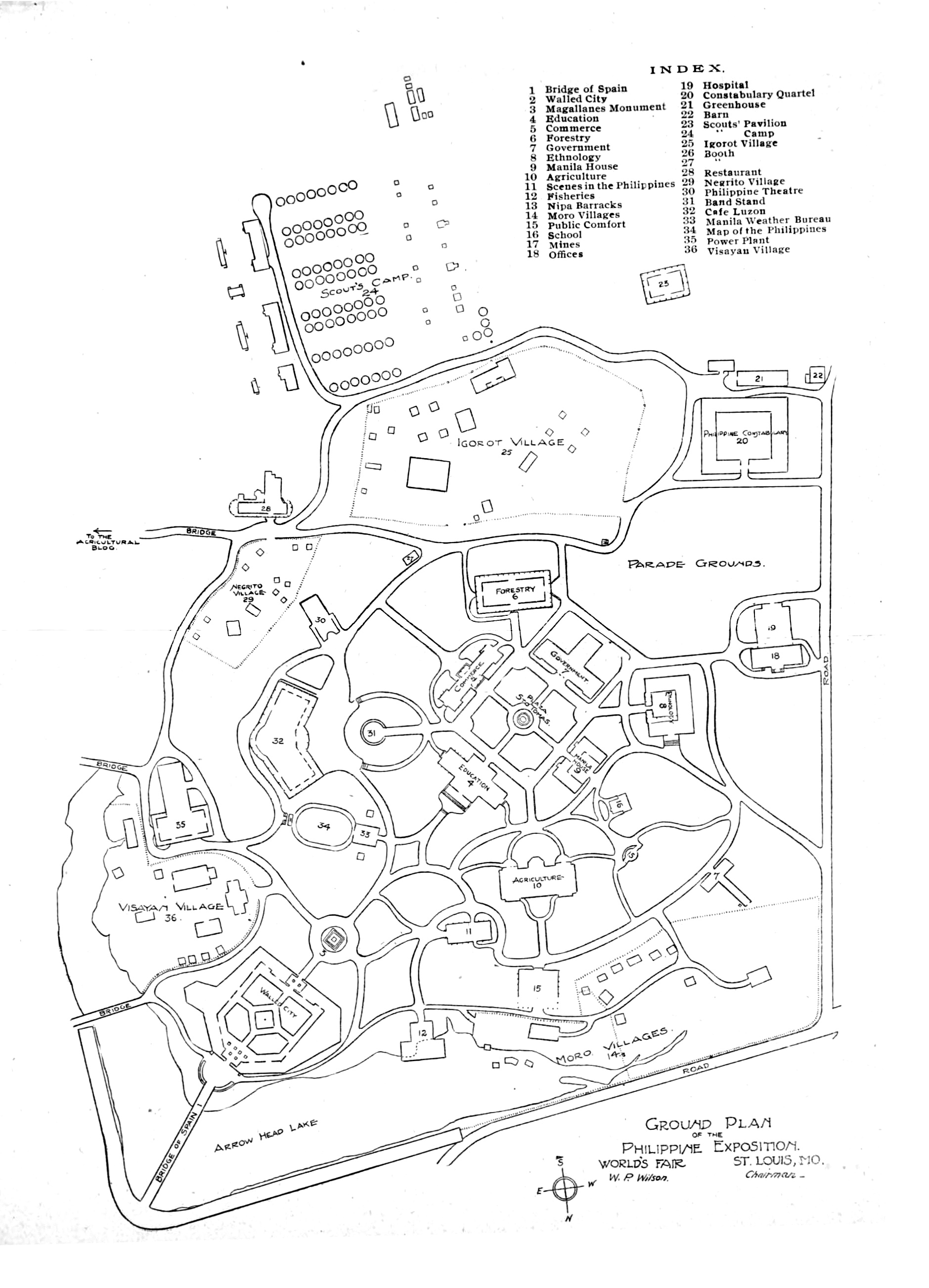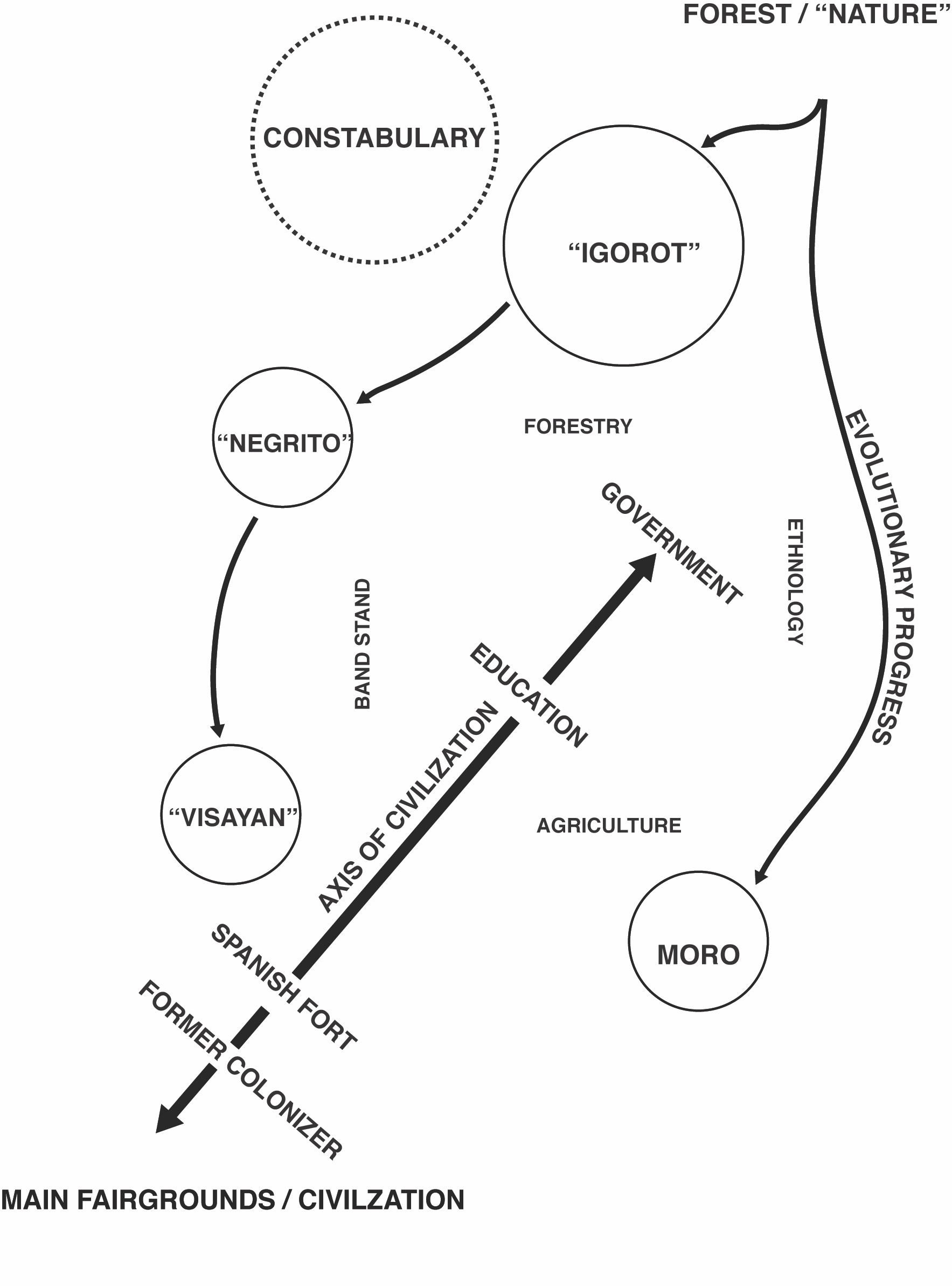 Organized according to a highly configured evolutionary narrative, the “Reservation” displayed members of the archipelago’s various native groups in p. 49 shelters built out of materials imported from the Philippines. These structures were grouped in replica villages and arranged along a path that led the viewer past “several stages of Filipino development.”16 At the entrance (closer to the “civilizational” center of the exposition) were the Christianized Visayans, whose village contained a small chapel that doubled as a one-room schoolhouse in which English classes were conducted. As one moved deeper into the exhibit (closer to the untouched areas of Forest Park), one encountered the more “primitive” tribes, including the bamboo and nipa lean-tos of the “Negritos” and what were presented as the more sophisticated mock villages of those referred to as “Igorots.”17 They were in turn followed by representatives of the islands’ “semi-civilized” Muslim populations—the seafaring Samal and highland Lanao Moros.18 Ambulating around the exhibit were seven hundred tribally unaffiliated members of the Philippine Constabulary, an American-trained paramilitary organization, who policed the people on display. The mock villages surrounded a plaza containing structures dedicated to commerce, education, and government, all built in Spanish mission style. Within this locally “civilized” center, meant to represent Manila, fairgoers had the opportunity to converse—in English—with fully “civilized” Filipinos represented by a cohort of “Pensionados” who took up residence in the simulated town center. As beneficiaries of American “tutelage,” these “civilized” Filipinos not only occupied the top of the exhibit’s simulated evolutionary hierarchy but also confirmed the benefits of American colonization.